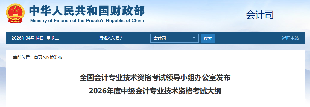 <h2 style="margin: 0px; padding: 0px 0px 15px; width: 915px; text-align: center; font-size: 24px; font-weight: bold; line-height: 45px; color: rgb(51, 51, 51); font-family: 'Microsoft YaHei'; font-style: normal; font-variant-ligatures: normal; font-variant-caps: normal; letter-spacing: normal; orphans: 2; text-indent: 0px; text-transform: none; widows: 2; word-spacing: 0px; -webkit-text-stroke-width: 0px; white-space: normal; background-color: rgb(255, 255, 255); text-decoration-thickness: initial; text-decoration-style: initial; text-decoration-color: initial;"><img src="https://static.sieredu.com/upload/0/common/2026041414/18d30a8cc3d2a22b7c6e98fb8185b82e.png" width="800" height="278" alt="" /></h2> <h2 style="margin: 0px; padding: 0px 0px 15px; width: 915px; text-align: center; font-size: 24px; font-weight: bold; line-height: 45px; color: rgb(51, 51, 51); font-family: 'Microsoft YaHei'; font-style: normal; font-variant-ligatures: normal; font-variant-caps: normal; letter-spacing: normal; orphans: 2; text-indent: 0px; text-transform: none; widows: 2; word-spacing: 0px; -webkit-text-stroke-width: 0px; white-space: normal; background-color: rgb(255, 255, 255); text-decoration-thickness: initial; text-decoration-style: initial; text-decoration-color: initial;">全国会计专业技术资格考试领导小组办公室发布</h2> <div style="margin: 0px; padding: 0px;">2026年度中级会计专业技术资格考试大纲</div> <div style="margin: 0px auto; padding: 0px 0px 20px; width: 915px; line-height: 28px; font-size: 14px; max-height: 1e+07px; color: rgb(51, 51, 51); font-family: 'Microsoft YaHei'; font-style: normal; font-variant-ligatures: normal; font-variant-caps: normal; font-weight: 400; letter-spacing: normal; orphans: 2; text-align: start; text-indent: 0px; text-transform: none; widows: 2; word-spacing: 0px; -webkit-text-stroke-width: 0px; white-space: normal; background-color: rgb(255, 255, 255); text-decoration-thickness: initial; text-decoration-style: initial; text-decoration-color: initial;"> <div style="margin: 0px; padding: 0px;"> <div style="margin: 0px; padding: 0px;"> <p align="justify" style="margin: 0px 0px 1em; padding: 0px; line-height: 1.8; font-family: 宋体; font-size: 16px;"> </p> <p align="justify" style="margin: 0px 0px 1em; padding: 0px; line-height: 1.8; font-family: 宋体; font-size: 16px;"> 为明确2026年度中级会计专业技术资格考试评价标准,全国会计专业技术资格考试领导小组办公室制定了2026年度中级会计专业技术资格考试大纲,现予发布。</p> <p align="justify" style="margin: 0px 0px 1em; padding: 0px; line-height: 1.8; font-family: 宋体; font-size: 16px;"> 附件:2026年度中级会计专业技术资格考试大纲</p> <p align="justify" style="margin: 0px 0px 1em; padding: 0px; line-height: 1.8; font-family: 宋体; font-size: 16px; text-align: right;"> 全国会计专业技术资格考试领导小组办公室</p> <p align="justify" style="margin: 0px 0px 1em; padding: 0px; line-height: 1.8; font-family: 宋体; font-size: 16px; text-align: right;"> 2026年4月7日</p> </div> </div> <div style="margin: 0px; padding: 0px; line-height: 28px;"> <p id="down-tit1" style="margin: 0px 0px 10px; padding: 0px; font-size: 16px;">附件下载:</p> <ul id="down1" style="margin: 0px; padding: 0px; list-style: none; font-size: 15px;"> <li style="margin: 0px; padding: 0px; list-style: outside none; font-size: 15px;"><span id="appendix1" style="margin: 0px; padding: 0px;"><a href="https://kjs.mof.gov.cn/zhengcefabu/202604/P020260409539308345570.pdf" style="text-decoration: none; color: rgb(43, 80, 168);">附件1:2026年度中级会计专业技术资格考试大纲.pdf</a></span></li> </ul> </div> </div>